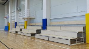 Vybavenie športovej haly, vyvýšené tribúny v Százhalombatte, Maďarsko